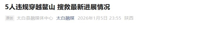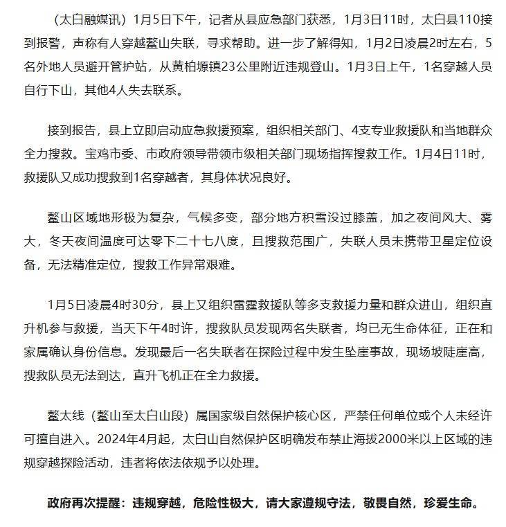 据“太白融媒”微信公众号,5人违规穿越鳌山,搜救最新进展情况公布: